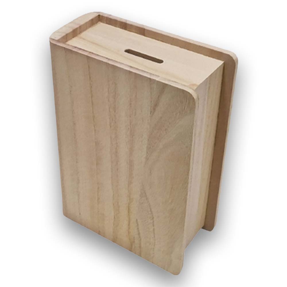 Deze unieke houten spaarpot in de vorm van een boek is een stijlvolle en originele manier om te sparen voor jouw volgende grote avontuur of een bijzonder moment.