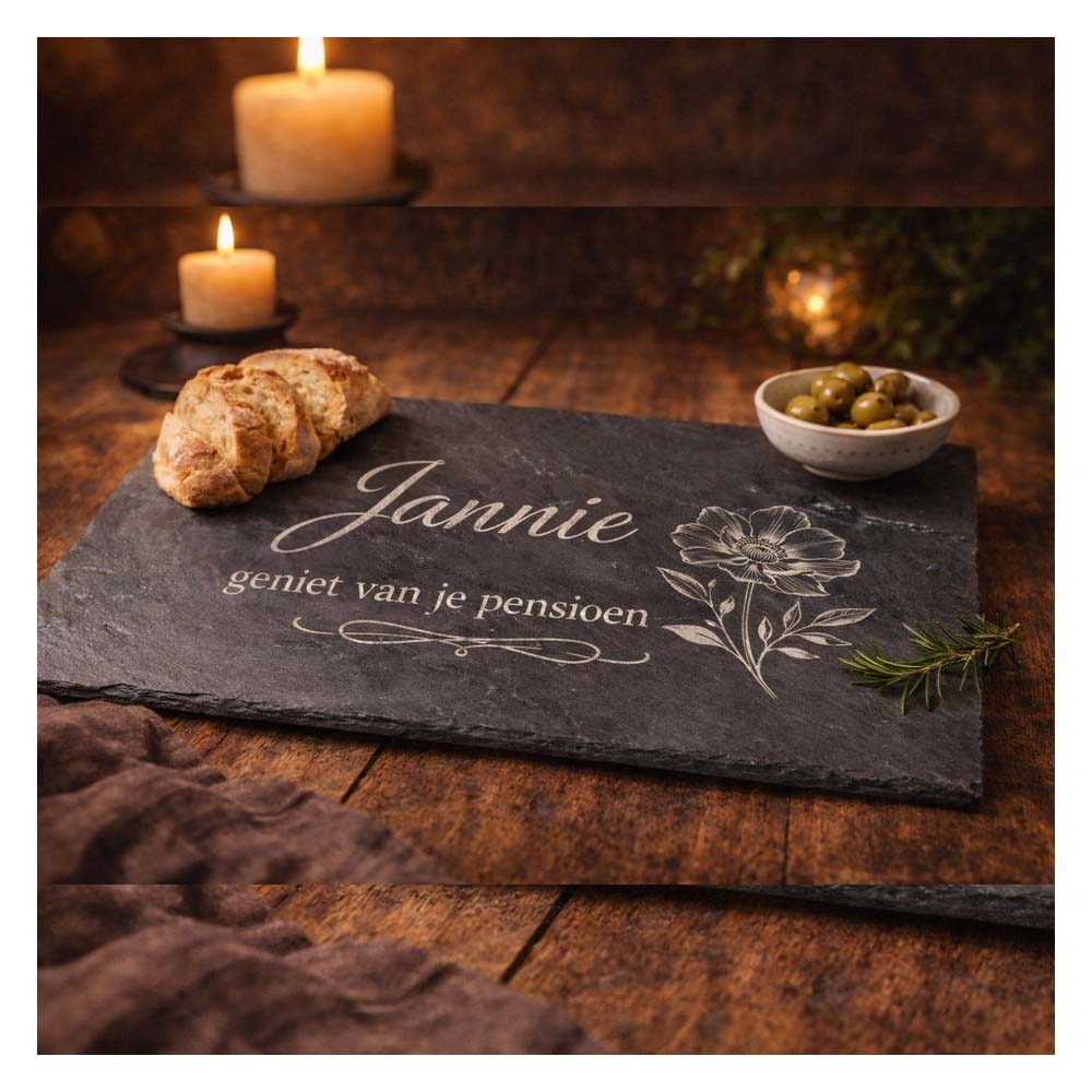 De echte eyecatcher is natuurlijk de hoogwaardige personalisatie. Wij graveren jouw gekozen tekst, logo of afbeelding direct in de steen via lasergravure of zandstralen. Dit resulteert in een schitterende, lichtgrijze gravure die nooit vervaagt. Of het nu gaat om een dierbare foto (omgezet naar lijntekening), een inspirerende quote of een bedrijfslogo, de afwerking is altijd stijlvol en permanent.