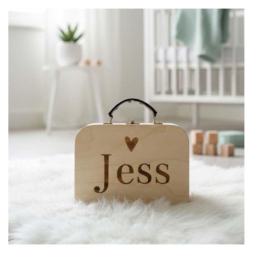 Wat dit koffertje écht tot een uniek erfstuk maakt, is de mogelijkheid om de voorzijde volledig te laten personaliseren. Wij graveren met uiterste precisie jouw eigen ontwerp in het hout. Denk aan de naam van de kleine reiziger, een schattige afbeelding of zelfs een gravure van het geboortekaartje.