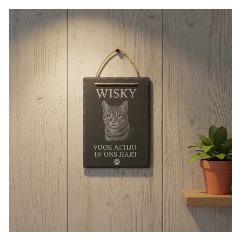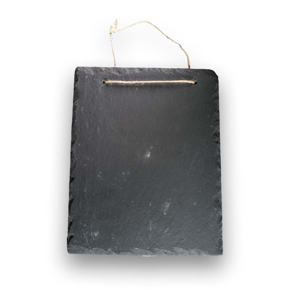 Dankzij onze geavanceerde graveertechnieken, laser of zandstralen, wordt jouw ontwerp diep en permanent in de steen verwerkt. De gravure heeft een chique, lichtgrijze kleur die prachtig afsteekt tegen het donkere leisteen. De hanger is standaard voorzien van twee boorgaatjes en een stoer jute touwtje, zodat je hem direct kunt ophangen.