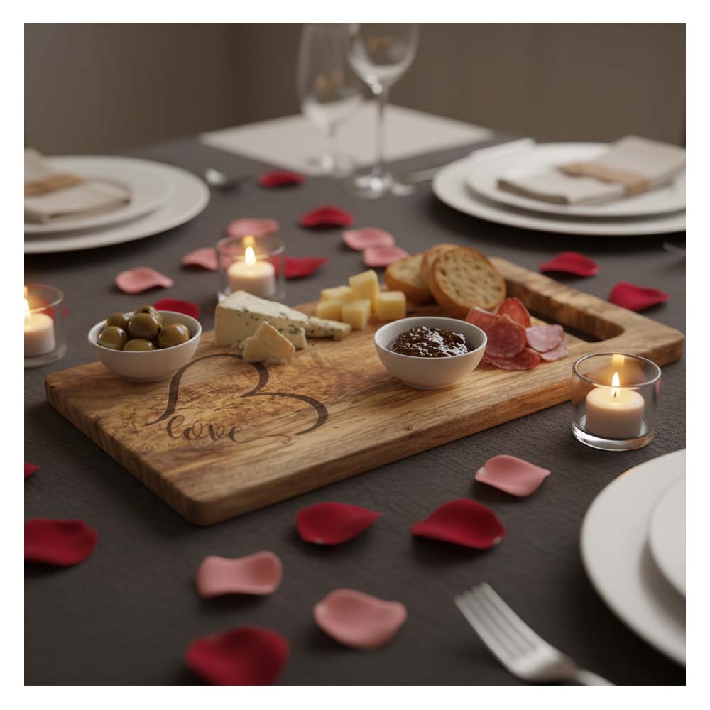 Wij graveren één zijde van het mangohout met uiterste precisie. Heb je een favoriete quote over koken? Wil je een verfijnde lijntekening van je eigen huis, of de namen van een bruidspaar in een prachtig lettertype? Dankzij onze lasertechniek branden we jouw ontwerp duurzaam in het hout, waardoor een prachtig contrast ontstaat met de natuurlijke tekening van het mango. Een onvergetelijk cadeau voor elke kookliefhebber of een prachtig gebaar bij een nieuwe woning.