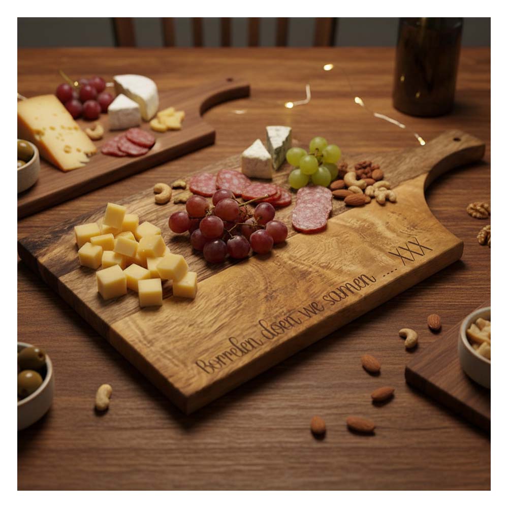 Of je nu kiest voor een hartelijke quote, een verfijnde lijntekening van je gezin of huis, een bedrijfslogo of een naam met een speciale datum; de lasergravure vormt een prachtig contrast met de diepe kleuren van het hout. Dit maakt de plank tot het ultieme cadeau voor een housewarming, huwelijk, of als luxe relatiegeschenk.